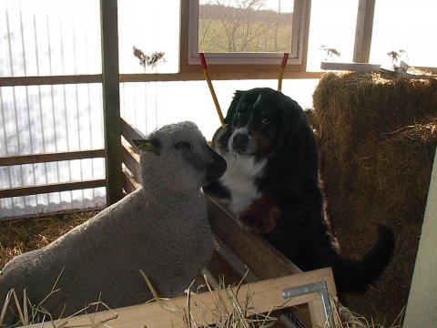 Hunde og lam hygger sig sammen